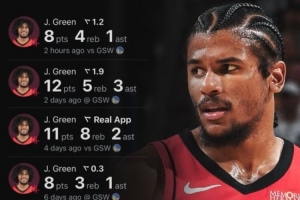 本场比赛杰伦-格林仍旧低迷,依然毫无状态8中3,其中三分2中0,罚球3中2,得到8分4篮板1助攻1封盖,正负值-6。