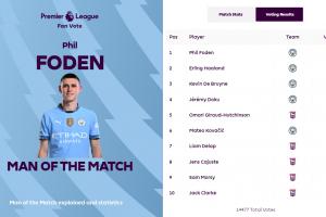 赛后,福登被英超官方评为全场最佳球员,他的得票率高达68.8%,位居次席的哈兰德得票率仅为10.8%。