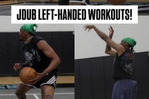 视频中可见,杰伦威用左手完成了拍球、投篮和单挑等一系列训练内容。