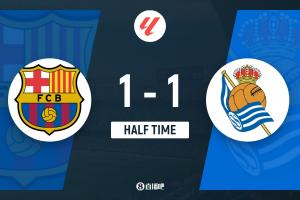 上半场伤停补时2分钟,半场结束,巴萨暂1-1皇家社会。