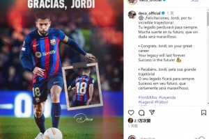 体育资讯10月9日讯 阿尔巴宣布本赛季结束后退役,巴萨名宿、现任总监德科社媒发文祝福。