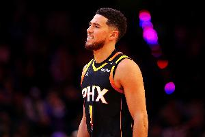 第三节比赛,上半场没怎么出手的布克终于找到手感,内外线火热,单节5中4(三分2中2)拿到12分1助攻1抢断,带队反超比分!