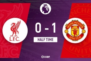 上半场伤停补时4分钟,半场结束,利物浦暂0-1曼联。