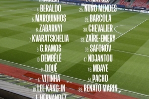 前锋:7-克瓦拉茨赫利亚、9-贡萨洛-拉莫斯、10-登贝莱、14-杜埃、19-李刚仁、29-巴尔科拉、47-恩贾恩图、49-姆巴耶
