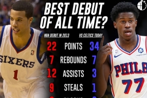 迈卡威首秀帮助76人击败三巨头带领的热火,出场36分10秒,投篮10投6中,三分6中4,罚球8中6,拿到22分7篮板12助攻9抢断。
