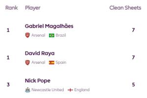 7次:加布里埃尔(阿森纳)、拉亚(阿森纳)
