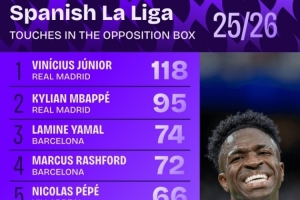 本赛季西甲在对方禁区内触球榜:维尼修斯118次居首,姆巴佩第二