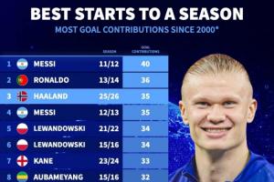 仅次于梅罗!本世纪赛季开局进球贡献数:哈兰德35球位列历史第三