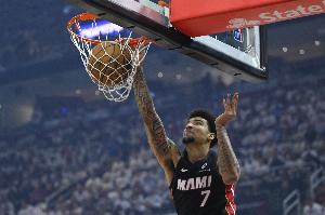 热火新星克雷尔·韦尔上半场表现积极,他在德拉蒙德下场时抢爆76人全队,半场就有7个进攻篮板,出战13分09秒,7投3中,三分1中1,罚球5中4,得到11分10篮板的两双,还有2抢断进账,正负值+15。