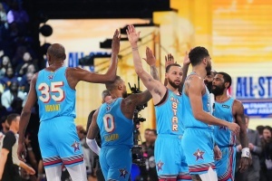 体育资讯2月17日讯 NBA全明星正赛决赛,奥尼尔队41-25战胜巴克利队,库里当选AMVP。