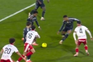西甲第14轮,皇马客场1-1战平赫罗纳,读秒阶段皇马获得绝杀机会,贝林厄姆禁区横敲,正对球门的罗德里戈调整步点准备射门,这时正对来球但侧对球门的姆巴佩半路杀出,转身兜射打偏。