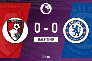 下半场伤停补时4分钟,半场结束,切尔西暂0-0伯恩茅斯。