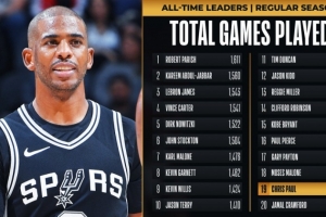 这样一来,保罗NBA生涯常规赛出场数达到1328场,超越贾马尔-克劳福德(1327),独占NBA历史第19位!