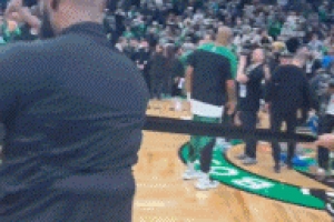 詹姆斯与在场上热身的塔图姆进行了互动,两人互相勾臂致意,然后聊了一下。