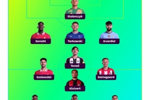 中场:索博斯洛伊(利物浦)、托纳利(纽卡)、克鲁伊维特(伯恩茅斯)、达姆斯高(布伦特福德)