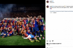 赛后,巴萨中场佩德里通过社交媒体晒出颁奖大合照:“国王杯已归诺坎普🏆!我们并肩战斗,共逐梦想。终极目标近在咫尺……冲啊! 🔵🔴”
